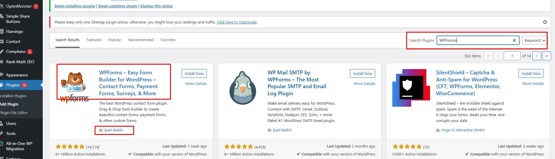 - Chọn plugin WPForms Lite – Drag & Drop Form Builder for WordPress (phiên bản miễn phí).