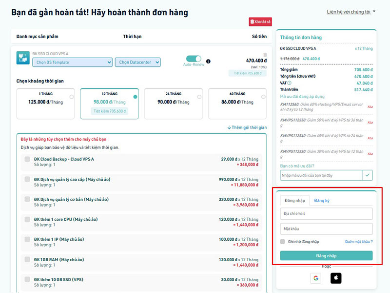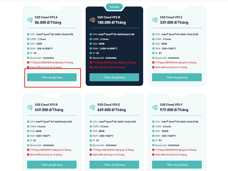 Bước 2: Sau khi chọn gói dịch vụ và bấm vào thêm giỏ hàng: