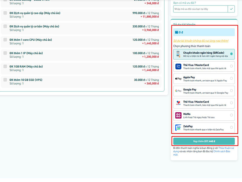 Khi vào lại giỏ hàng bạn chọn phương thức và tiếp tục thanh toán. Sau khi thanh toán thành công, Nhân Hòa sẽ gửi mail và có nhân viên gọi điện hỗ trợ bạn việc cài đặt và sử dụng VPS.